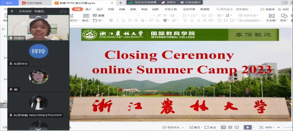 结营仪式上,学生发表了感言,并一起欣赏了同学们为夏令营学习制作的vlog。同学们讲述了自己这十天夏令营的体验感受:有表达对此次学习机会的感谢,有对提升汉语水平的开心,有讲了自己心中的中国形象,有感谢老师们的认真授课让自己学到了文化知识,还有表达了自己今后想来中国留学的愿望。老师也对本次充实的夏令营进行了总结,表达了与同学们相遇相处的开心与愉悦,并欢迎同学们今后来浙江农林大学学习。