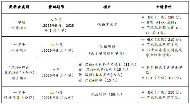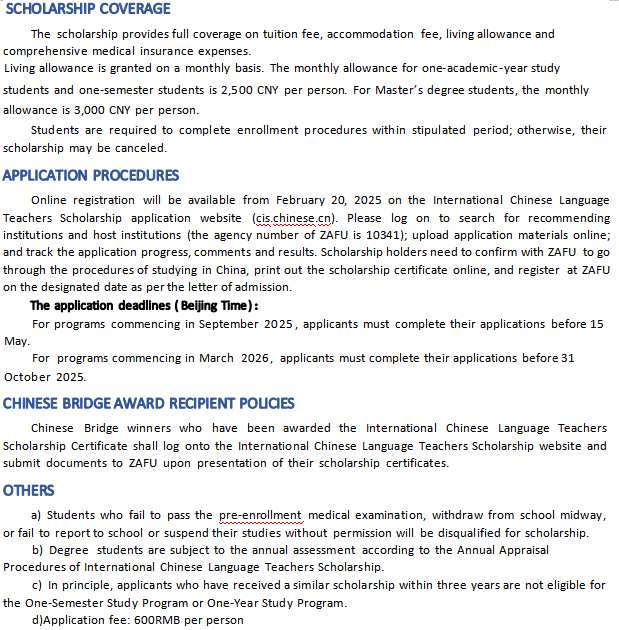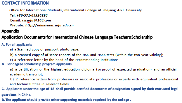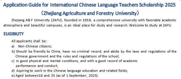 2025年2月20日起,登录国际中文教师奖学金报名网站(cis.chinese.cn),查询推荐机构与接收院校(浙江农林大学的组织机构代码是10341);在线提交申请材料,关注申请进程、审核意见与奖学金评审结果。获奖者与浙江农林大学确认办理来华留学手续,在线打印获奖证明;按录取通知书规定的时间入学报到。