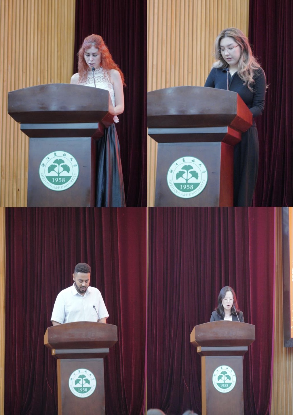 新生代表国际中文教师奖学金语言生玛丽亚(法国籍)、硕士生明珠(吉尔吉斯斯坦籍),在校生代表硕士生山姆(埃塞俄比亚籍),教师代表范迪先后发言。