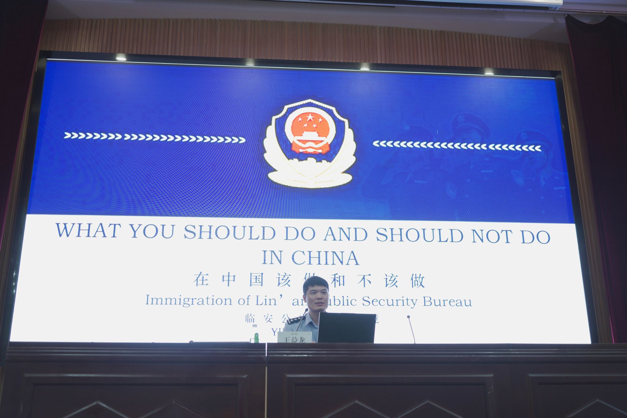 随后,赵有华和学院校外辅导员、临安区公安局出入境管理科王益龙警官分别为全体国际学生作法制安全教育专题讲座,紧密结合国际学生在华学习生活的实际特点与潜在风险,聚焦禁毒知识、出入境管理规定、交通安全、治安防范、电信网络诈骗识别与预防、宗教活动法律法规等重点领域,通过典型案例以案释法,教育引导国际学生严格遵守法律法规和校纪校规,时刻绷紧安全之弦,切实提升自我保护意识和能力,共同维护国际学生群体的良好形象。