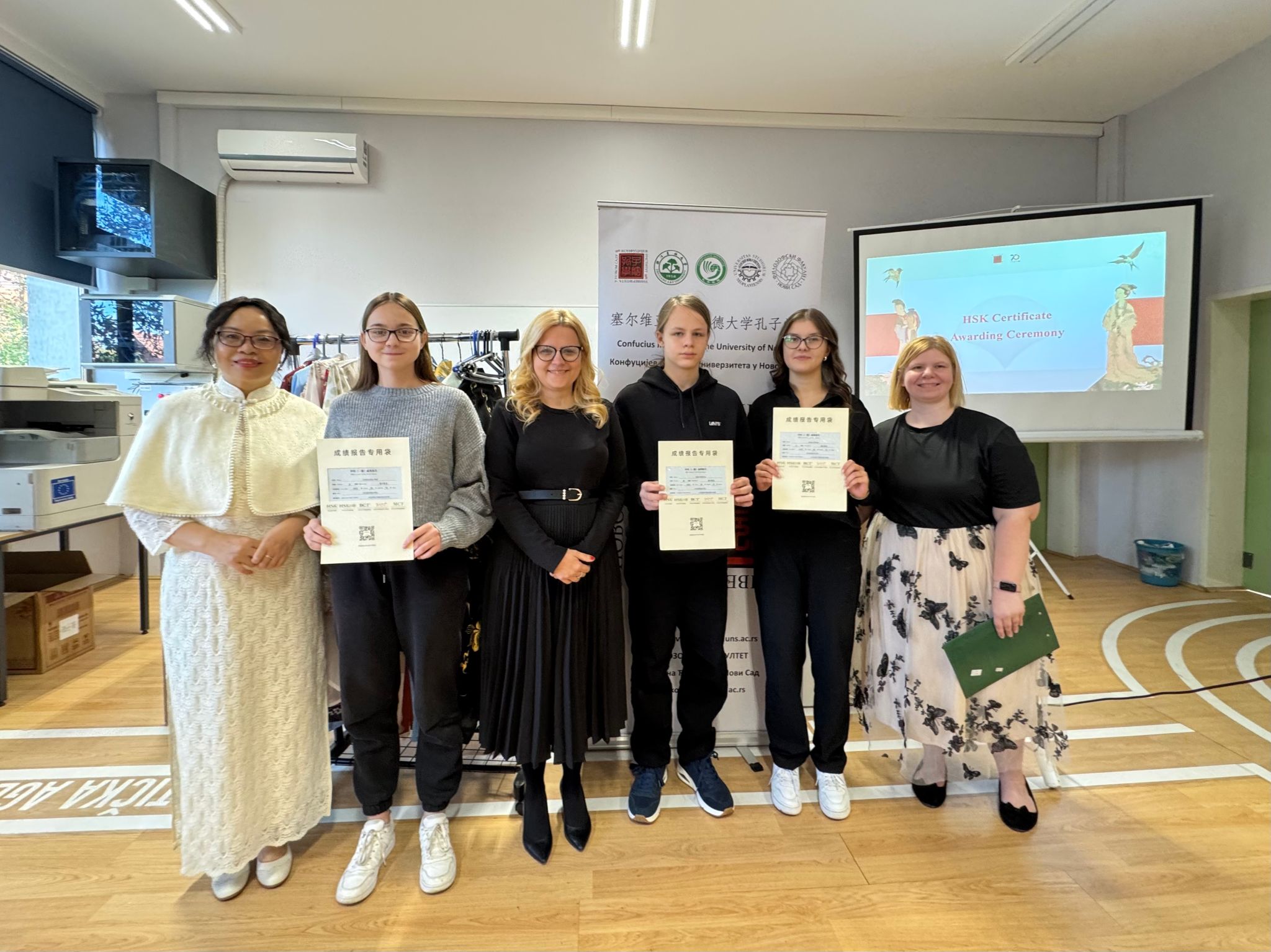活动融合了教学成果展示和文化交流活动。教学成果展示环节,诺大孔院中方院长陈秀与娜塔莉亚校长(Natalia Budinski)为2025年度通过HSK考试的优秀学员颁发证书;学员伊萨克(IsakNovta)分享了他参加暑期赴华夏令营的难忘经历。