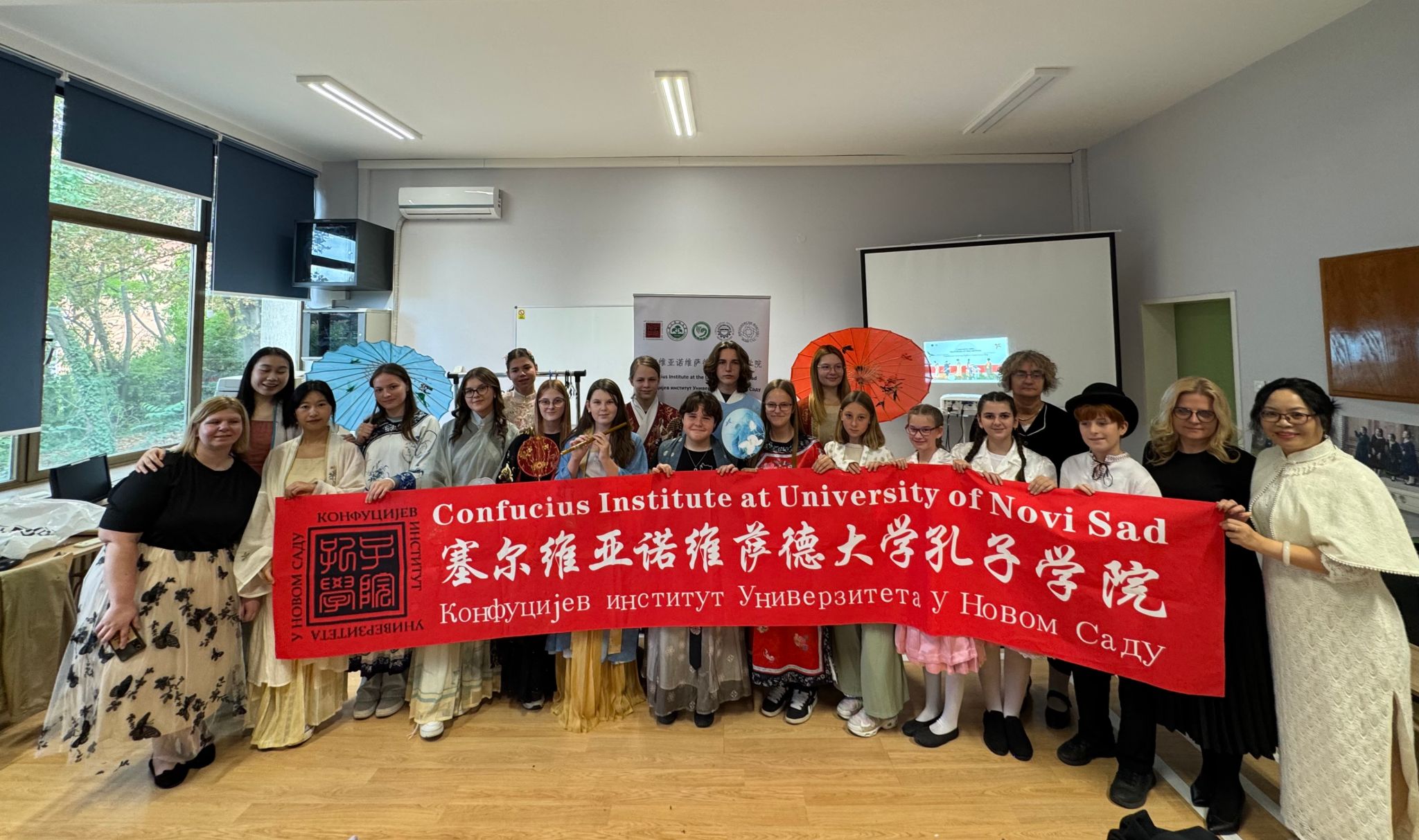 汉服体验区成为全场焦点。塞尔维亚学生在孔院老师指导下学习穿戴汉服、体验传统礼仪。当身着汉服的学生们集体亮相时,现场掌声不断,将活动气氛推向高潮。